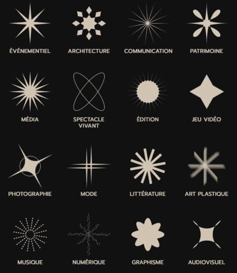 Musique, audiovisuel, spectacle vivant, événementiel, communication, numérique, graphisme, design, média, jeu vidéo, édition, patrimoine, photographie, littérature, mode, architecture.